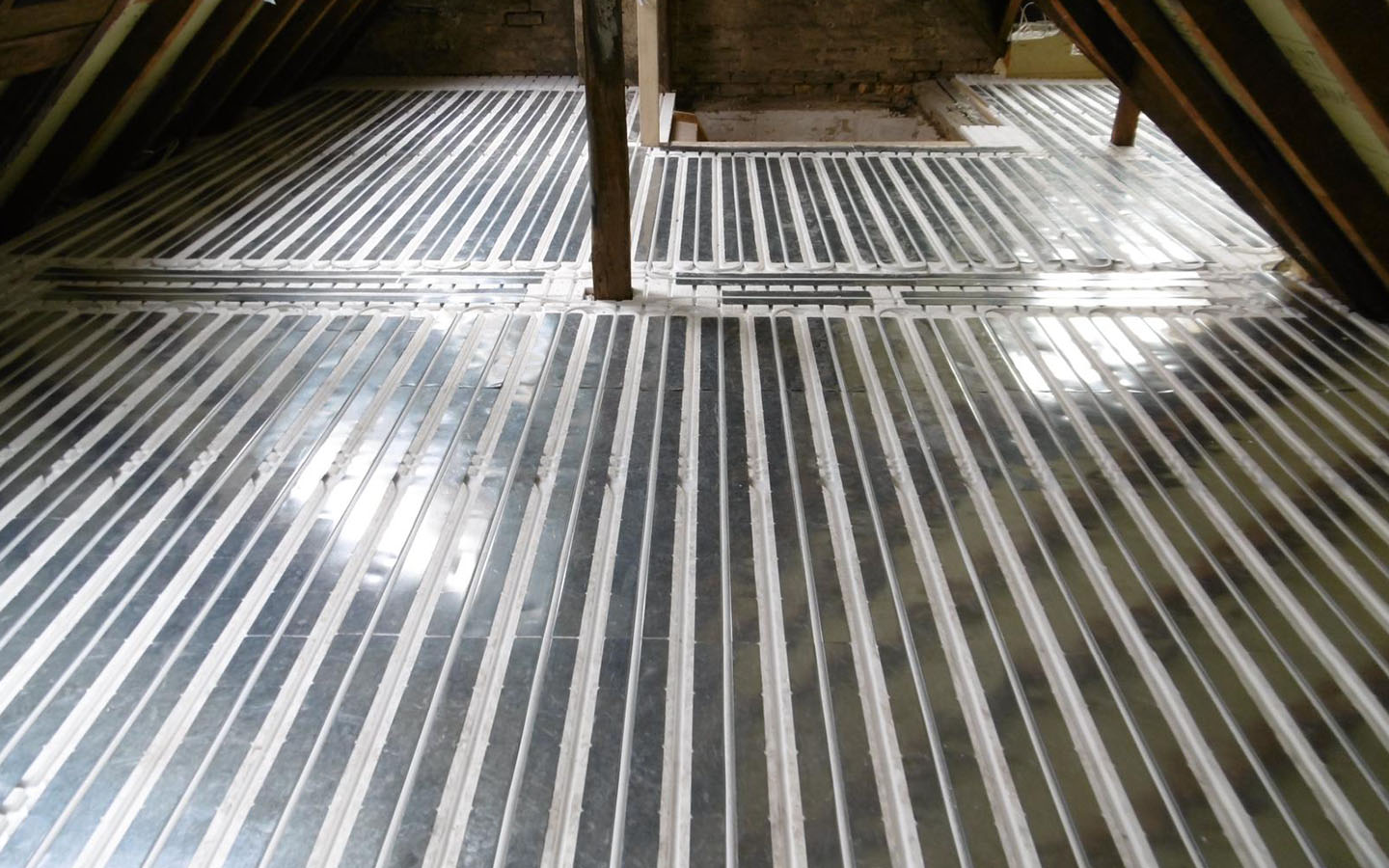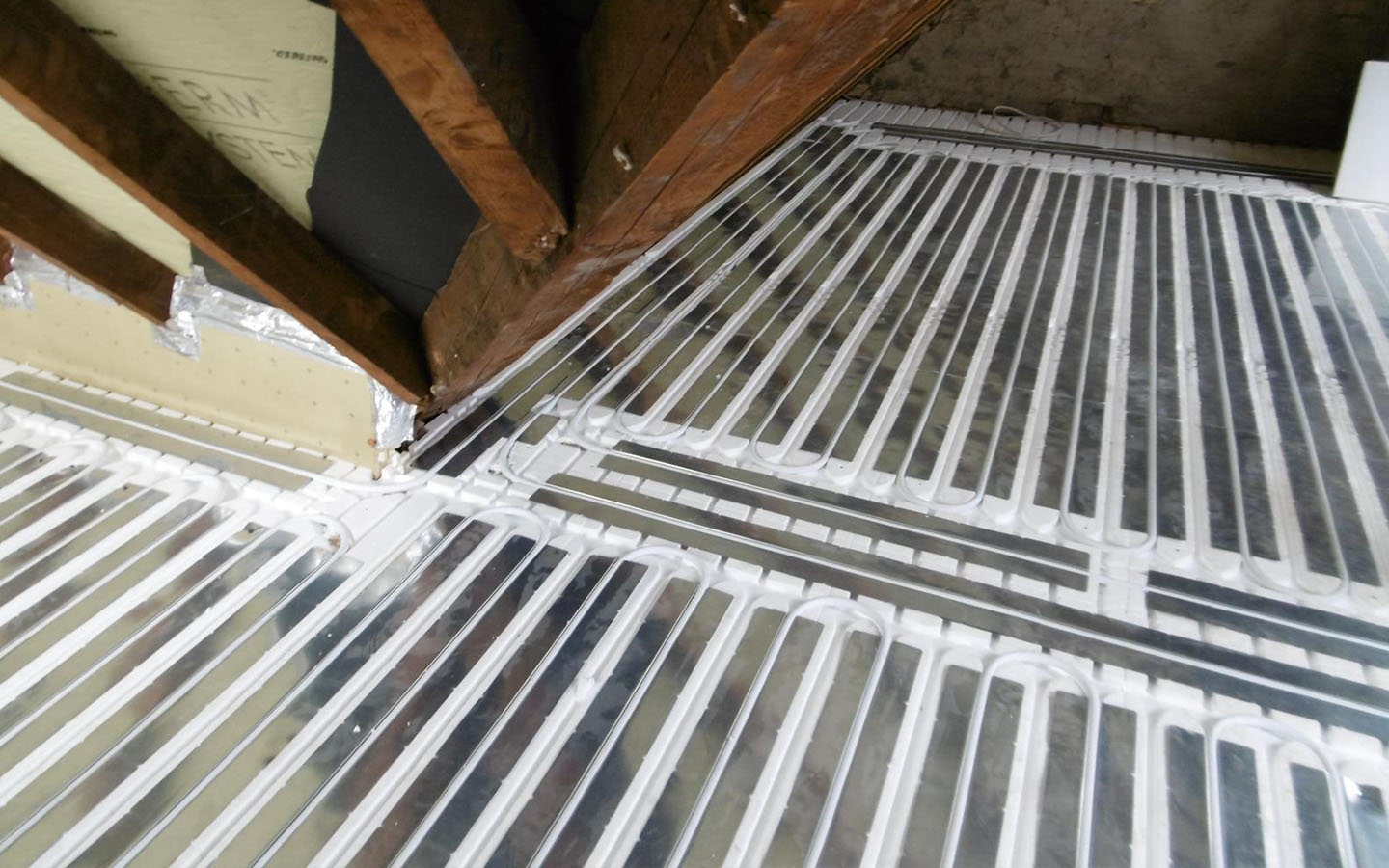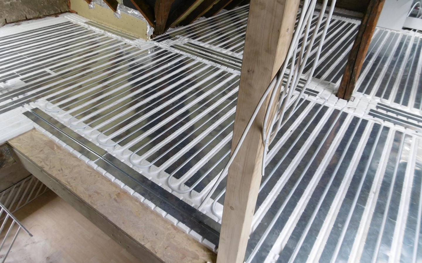 Einbau einer Fußbodenheizung im Dachgeschoss eines Altbaus. Unsere Aufgabe war es, eine Lichtheizung zu installieren. Um das Stockwerk nicht zu belasten, haben wir eine Fußbodenheizung auf Basis von speziellen Styroporplatten hergestellt.