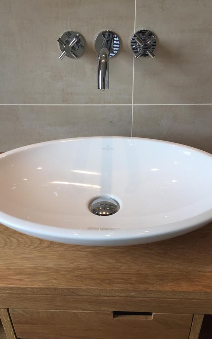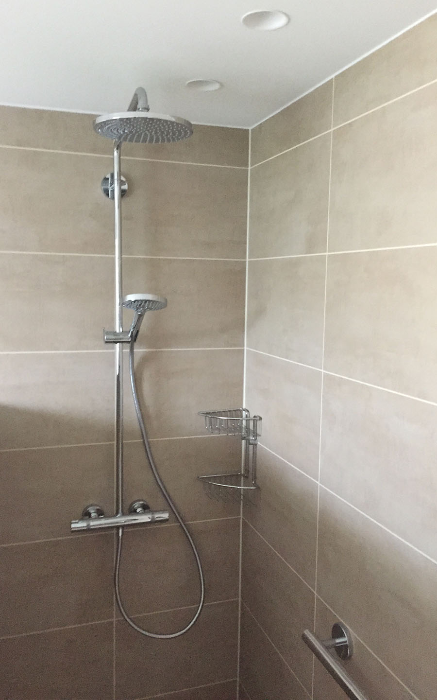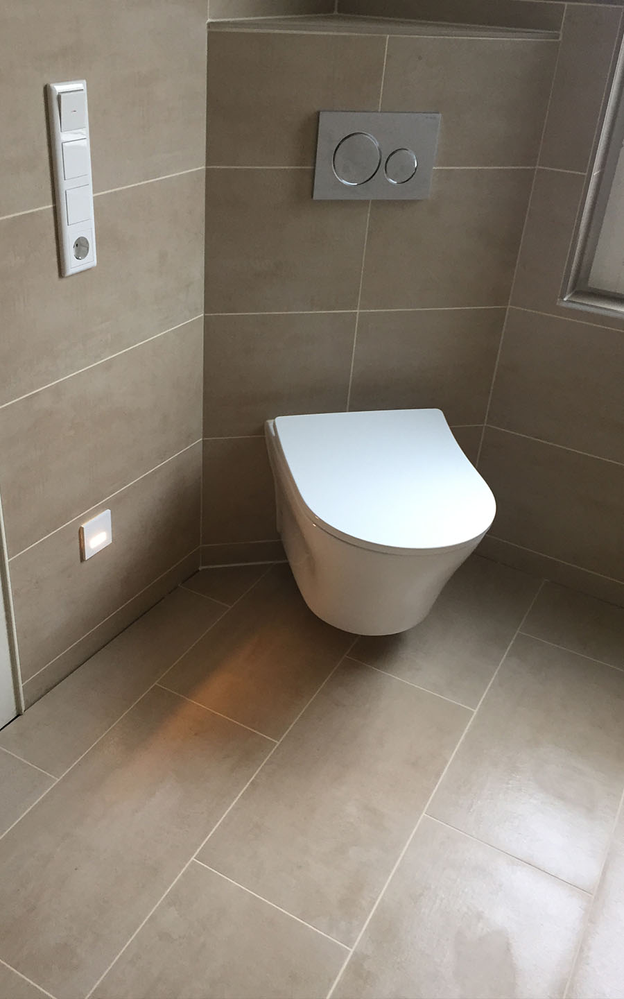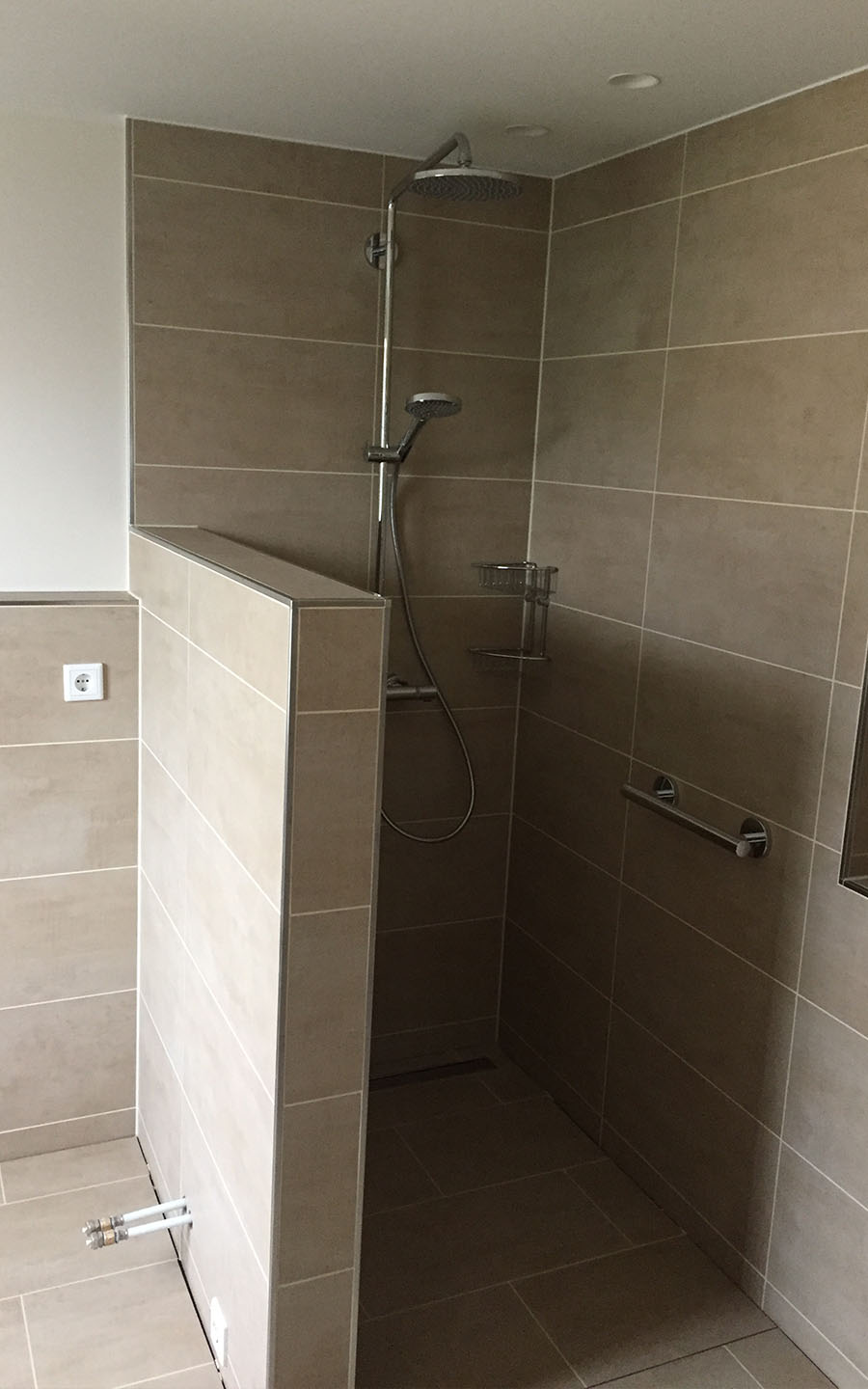 Einbau einer Fußbodenheizung in Kombination mit einem Heizkörper. Die Armaturen wurden flächenbündig eingebaut. Es wurde eine Regenschauer in der kleinen offenen Dusche eingebaut. Diese lässt das Bad größer erscheinen.