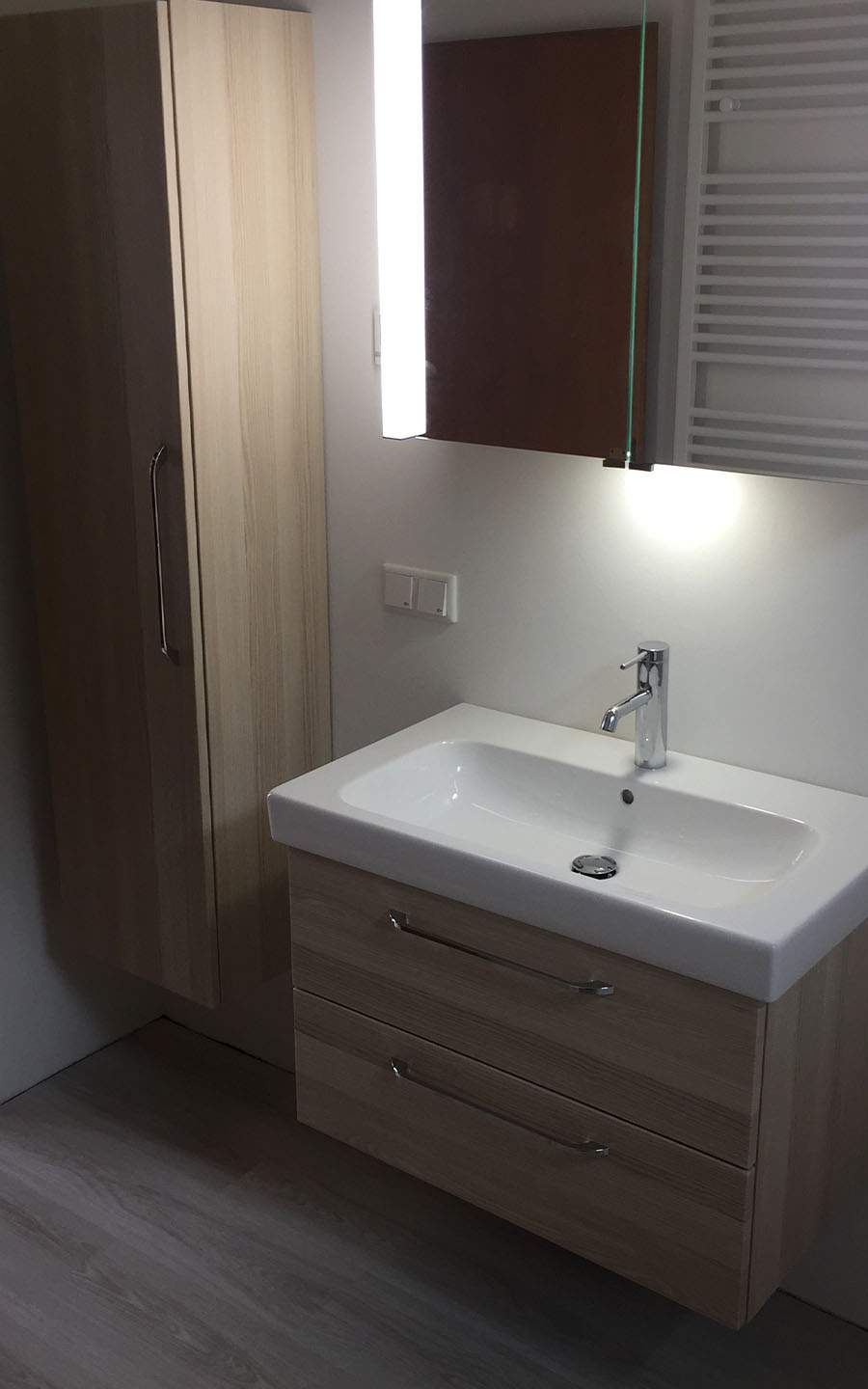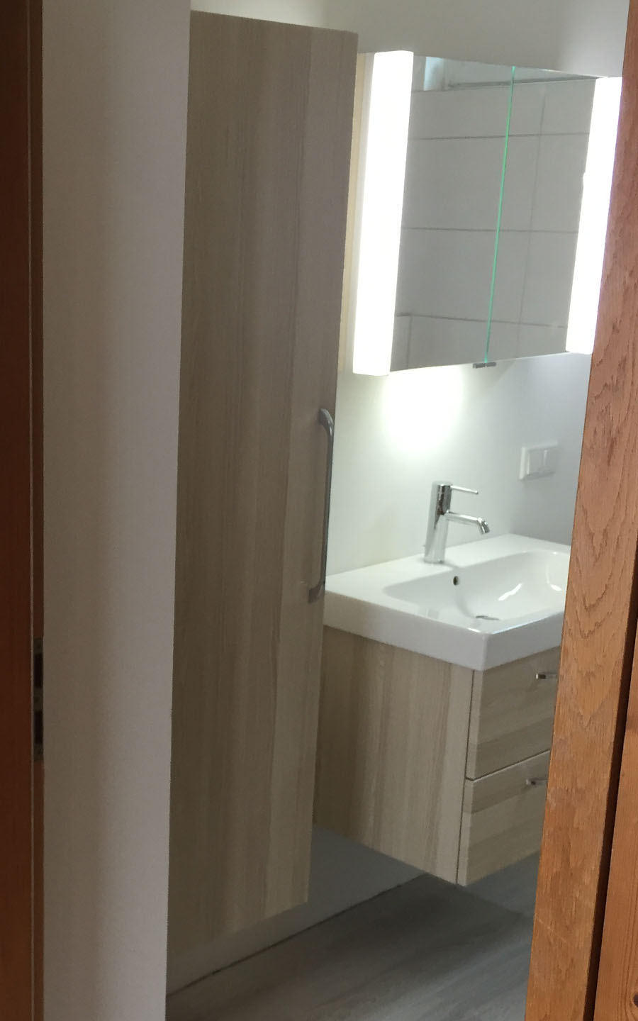 Es wurde eine komplett neue Elektroinstallation gemäß VDE-Standards vorgenommen. Eine elektrisch betriebene Fußbodenheizung wurde installiert. Es wurde eine Badewanne mit Duschfunktion und Regendusche eingebaut. Eine moderne Halogendeckenbeleuchtung vollendet das stimmige Badbild.